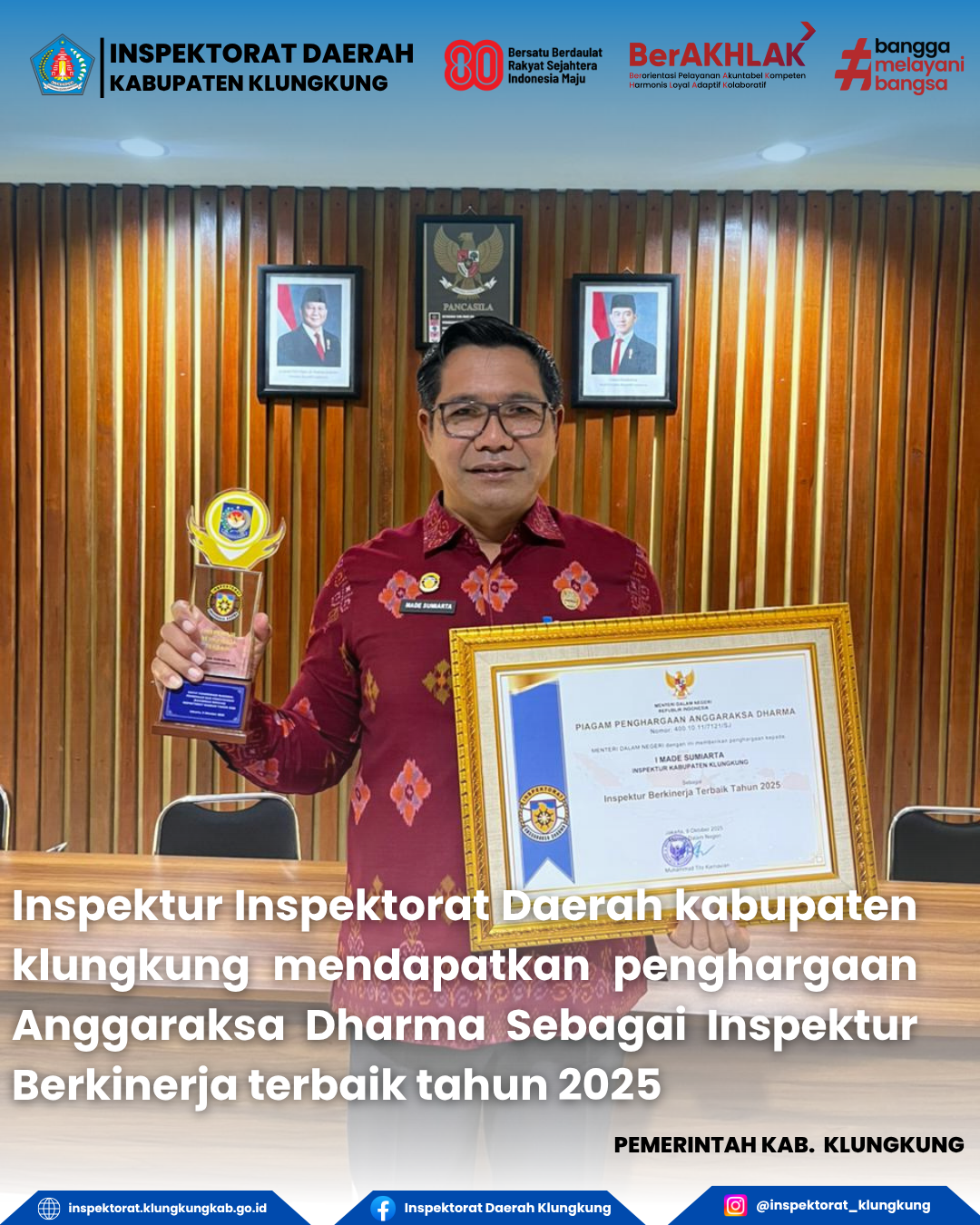 Selamat dan bangga!Inspektur Inspektorat Daerah Kabupaten Klungkung I Made Sumiarta, SH., M.A.P dianugerahi Penghargaan Anggaraksa Dharma 2025 sebagai Inspektur Berkinerja Terbaik Nasional.Penghargaan ini menjadi bukti komitmen kami dalam mewujudkan pengawasan yang profesional, akuntabel, dan berintegritas demi tata kelola pemerintahan yang lebih baik.#AnggaraksaDharma #InspektoratKlungkung #BerAKHLAK #SMARTASN