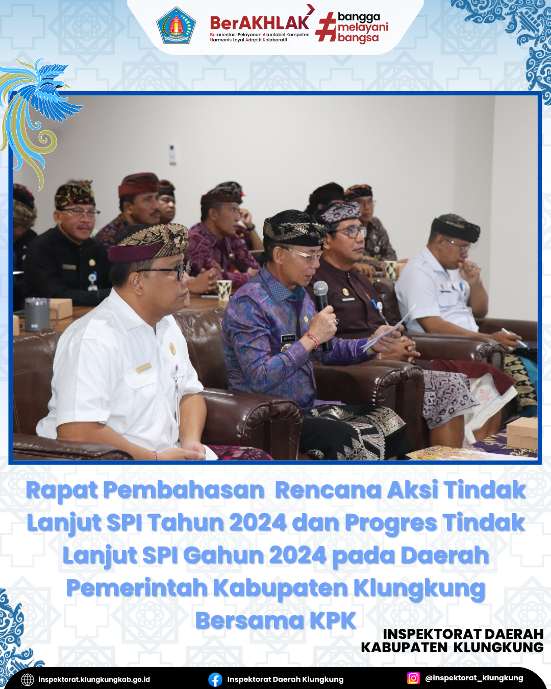 Rapat monitoring dan evaluasi atas renaksi tindak lanjut rekomendasi hasil Survey Penilaian Integirtas (SPI) 2024 telah dilaksanakan hari ini pukul 09.00 di ruang rapat inspektorat daerah kabupaten klungkung bersama KPK RI dengan Bupati, Sekretaris Daerah dan seluruh OPD se Kabupaten Klungkung. Rapat monev ini dilaksanakan sebagai upaya dari KPK RI untuk pemantauan progress tindak lanjut … Read more